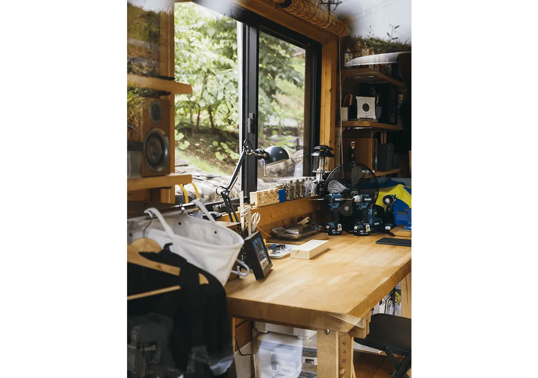 釣り道具用だったIMAGO。完成してからはDIYに夢中に。工具一式が揃う。棚やテーブルもすべて手作り。