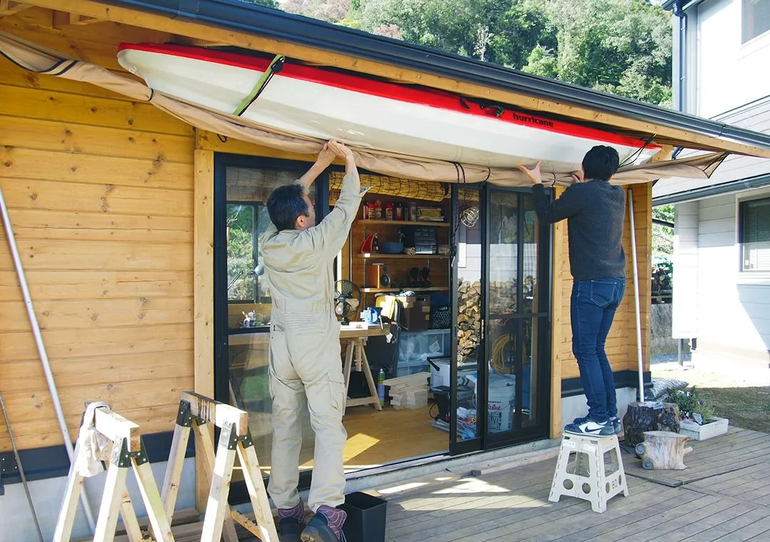 造りつけやすい無垢材だから、いろいろなアイディアがわく。IMAGOの軒先には、シーカヤックを吊るして収納。ジャストフィットで映えます。